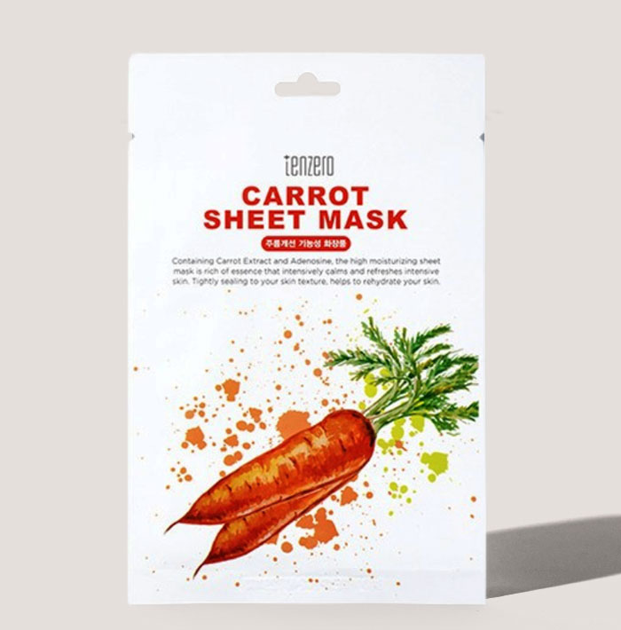 Tenzero Carrot Sheet Mask është një maskë me ekstrakt karrote. Rikthen lëkurën e lodhur, përshpejton shërimin e dëmtimeve, normalizon ekuilibrin e ujit dhe përmirëson lëkurën. Karrota pastron dhe freskon lëkurën, e pasuron atë me beta-keratinë, vitamina dhe mikroelementë të tjerë të rëndësishëm. Ajo neutralizon efektet negative të radikaleve të lira, zbut rrudhat dhe përmirëson gjendjen e lëkurës.